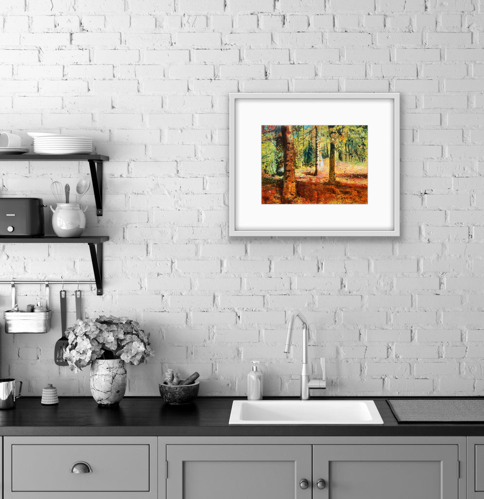 Double mounted, glazed and framed in white tulip 14” x 12”