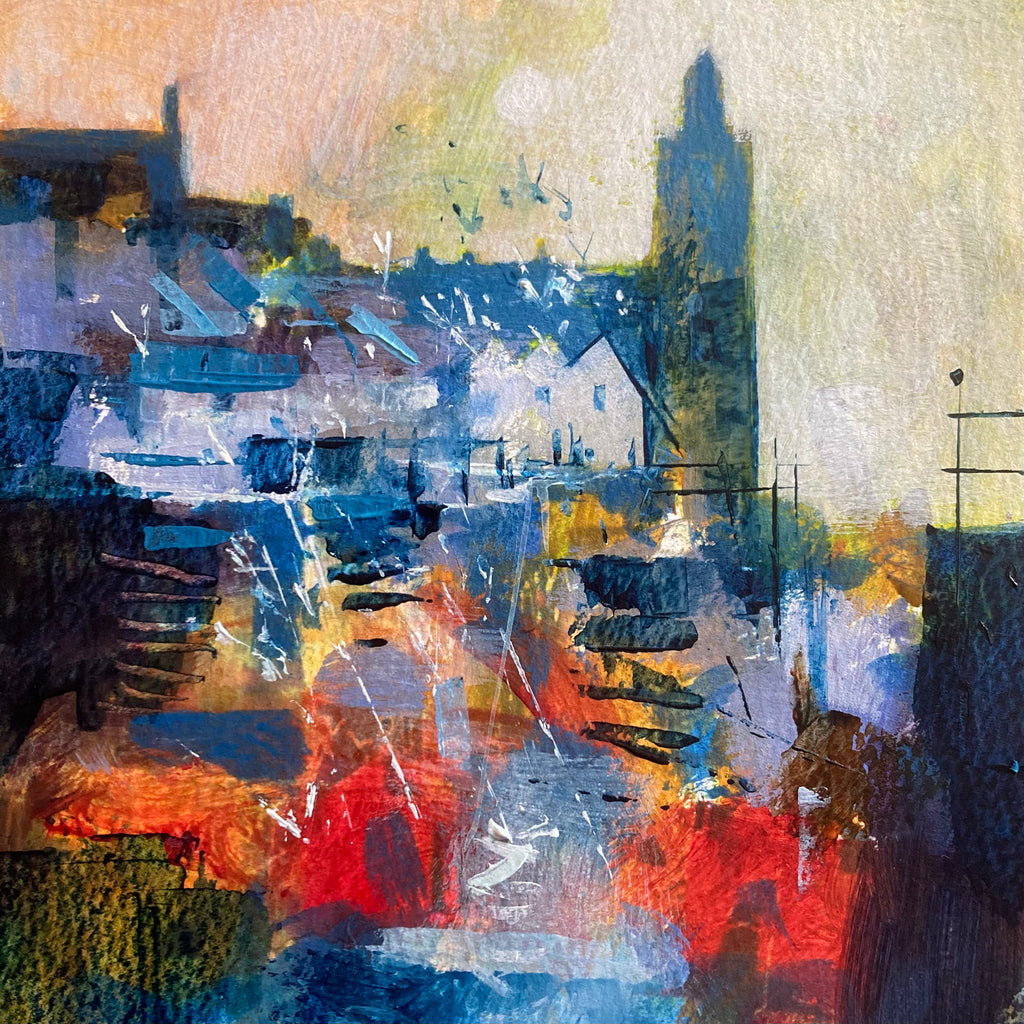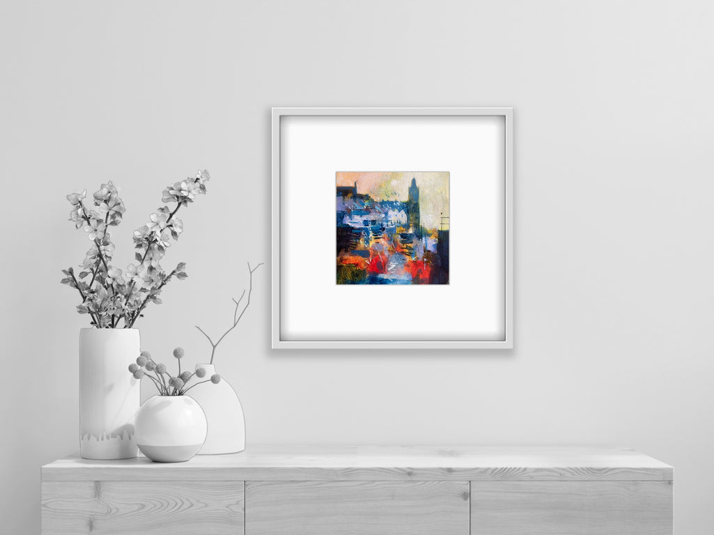Original artwork, mixed media on board, doubled mounted and framed in tulip.