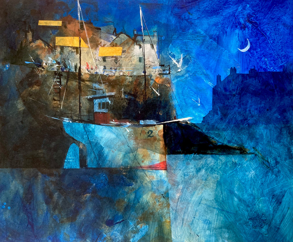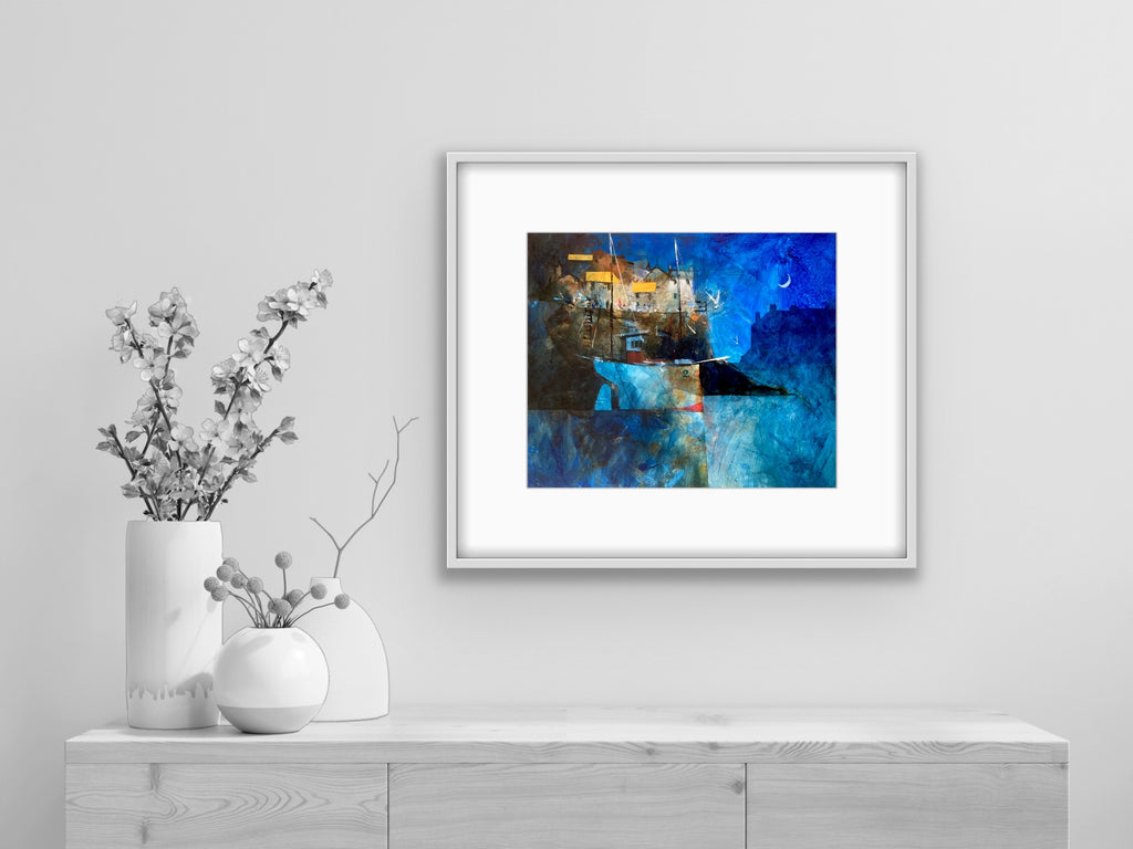 Original artwork, mixed media on board, doubled mounted and framed in tulip.