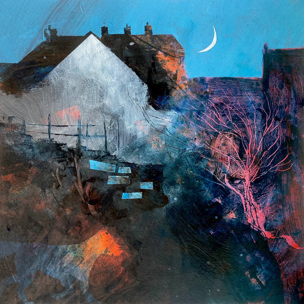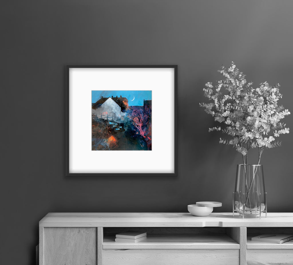 Original artwork, mixed media on board, doubled mounted and framed in tulip.