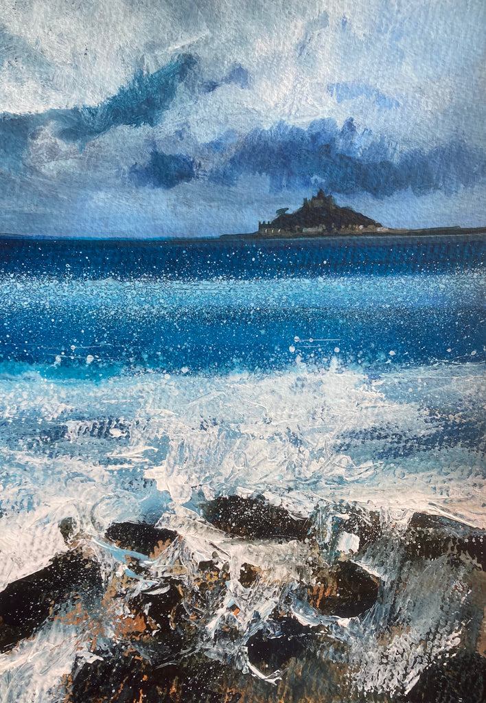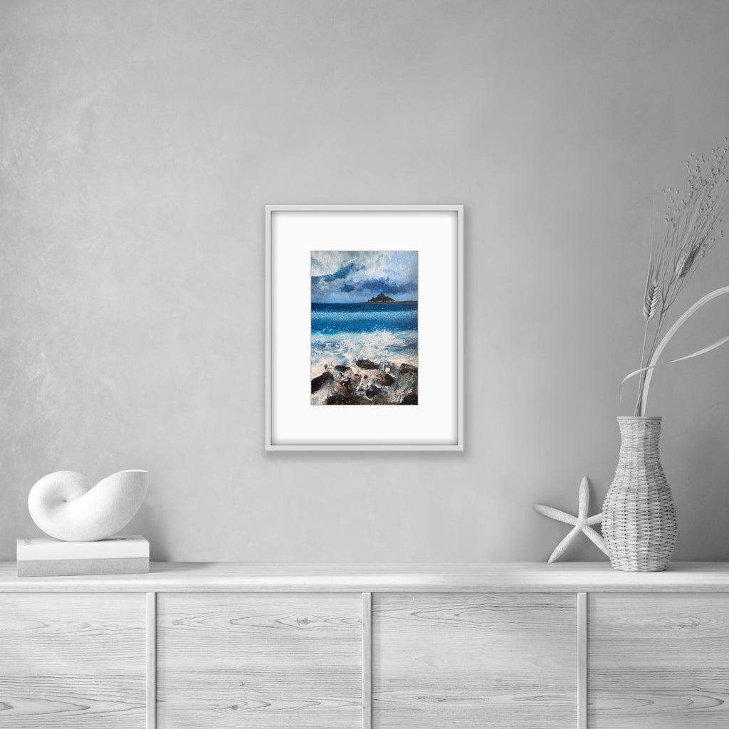 Original artwork, mixed media on board, doubled mounted and framed in tulip.
