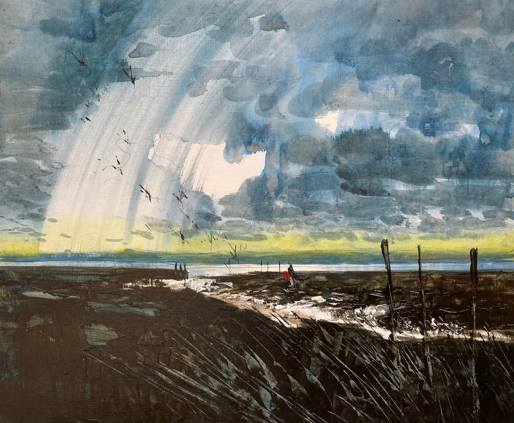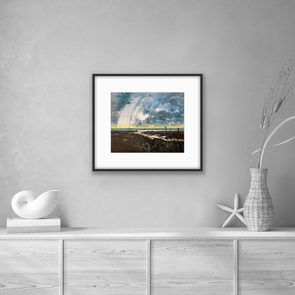 Original artwork, mixed media on board, doubled mounted and framed in tulip.