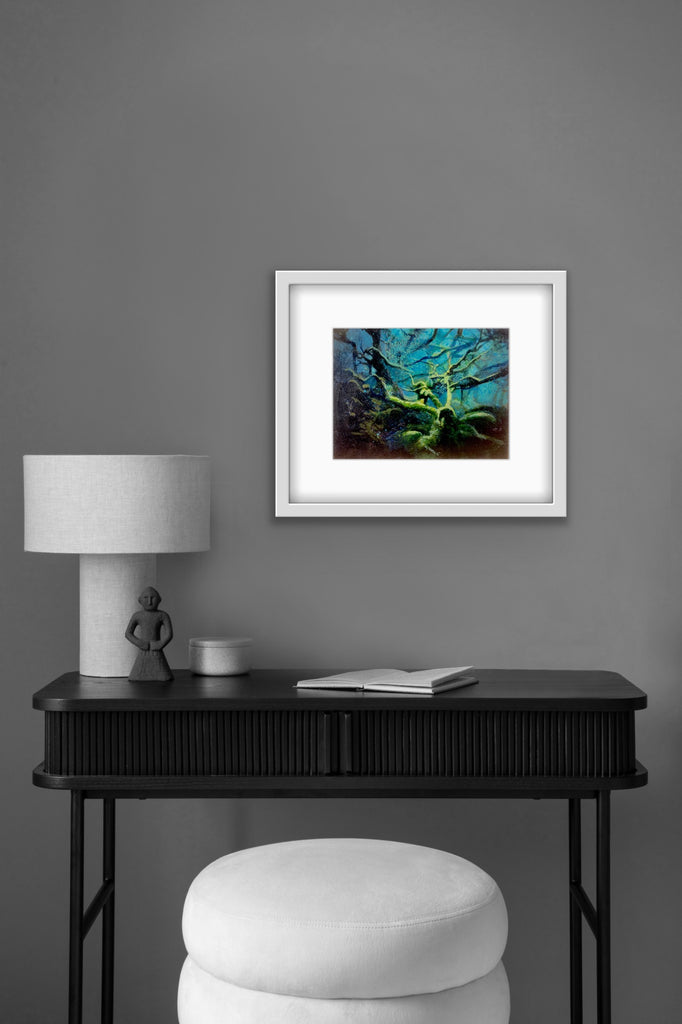 Double mounted, glazed and framed in white tulip 14” x 12”